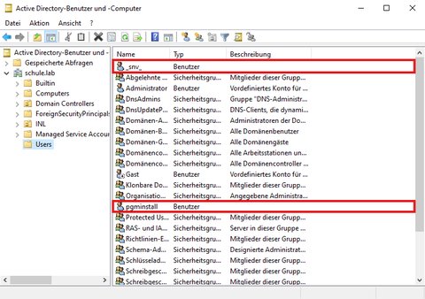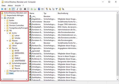 | Active Directory Objekte im Container Users (CN=Users,CN=schule,CN=local) | ||
